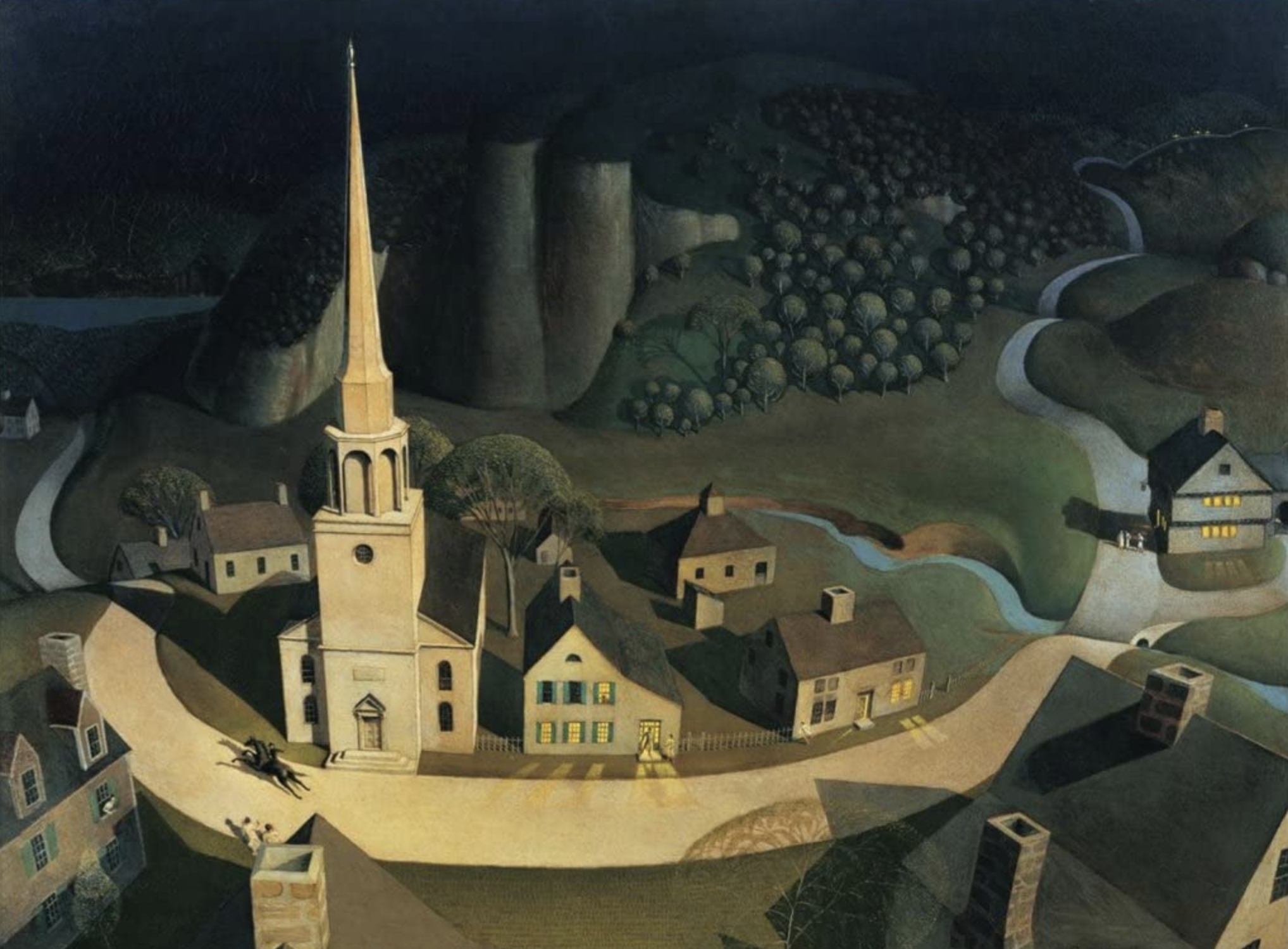 The set by Santo Loquasto is inspired by the art of Grant Wood (born in Anamosa, Iowa), a town which may not be too different from River City. There is even a backdrop inspired by Wood's "The Midnight Ride of Paul Revere." Interestingly enough, from my seat in the house (Orchestra, Row J seat 2) I couldn't see Paul Revere. Why was he eliminated?